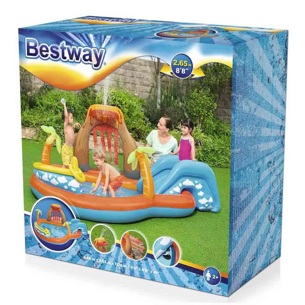 Diseñado para que los niños se muevan, se diviertan y salgan de la casa, el centro de juegos Lava Lagoon ha sido probado en calidad y se enfoca nuevamente en la diversión. Hay un rociador de agua que se conecta a una manguera de jardín, lo que mantiene a sus hijos frescos mientras juegan. El centro de juegos incluye 4 pelotas de juego para subir y bajar por la rampa de pelotas inflables y 1 aro inflable para jugar al lanzamiento de aros. También se incluye un tobogán extraíble con cuerdas de amarre y ojales integrados. El cojín hinchable del suelo de la piscina aporta un extra de comodidad a los más pequeños. ¡Con las palmeras inflables, tu pequeño sentirá que está a un mundo de distancia! ¡El rociador de agua se conecta a la manguera del jardín y mantiene a sus hijos frescos durante los calurosos meses de verano! Cuando haya terminado con Play Center, libere el agua de la piscina con la válvula de drenaje fácil de usar. ¡Con suficiente espacio para amigos, chapotear bajo el sol nunca ha sido más divertido que con Lava Lagoon Play Center!