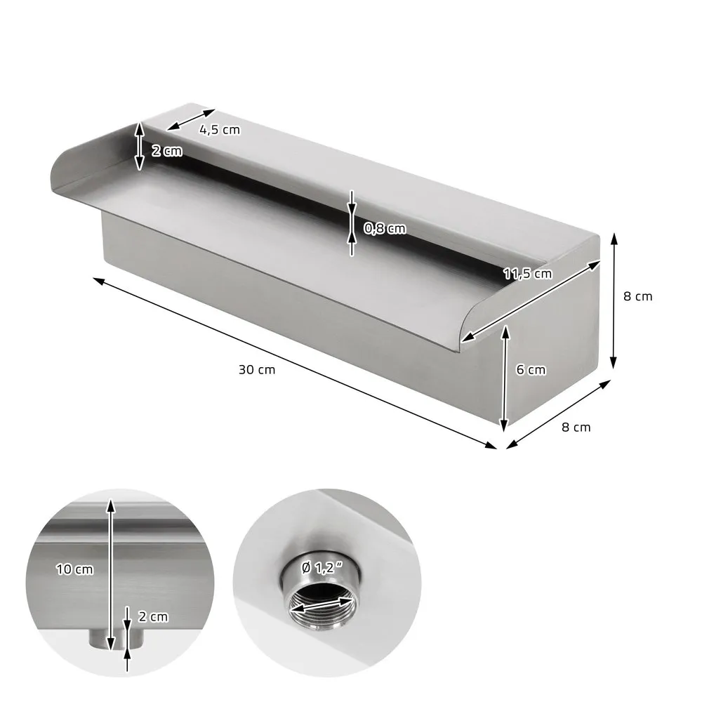 Con esta cascada versátil y de alta calidad fabricada en acero inoxidable, puede crear un punto de atracción visual en estanques, piscinas y zonas de entrada. Con un práctico tamaño de 30 cm, la cascada puede fijarse fácilmente a las paredes o integrarse en la mampostería. De este modo, puede crear una hermosa fuente de agua con sonidos relajantes incluso en los espacios más pequeños.