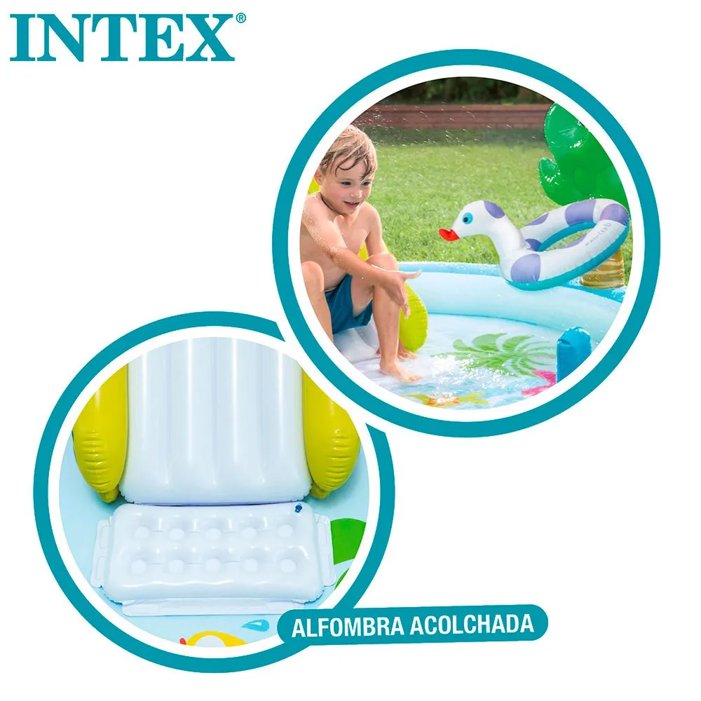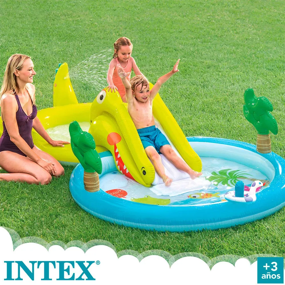 Centro de juegos infantil hinchable de Intex, con dos piscinas de 180 y 132 litros respectivamente y tobogán con base acolchada y forma de cocodrilo.